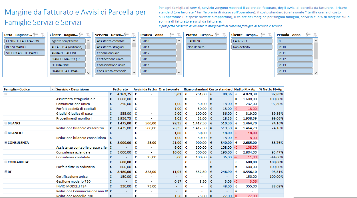 Per ogni famiglia di servizi, servizio vengono mostrati il valore del fatturato, degli avvisi di parcella da fatturare, il ricavo standard (ore lavorate * tariffa oraria di ricavo sull’operatore), il costo standard (ore lavorate * tariffa oraria di costo sull’operatore + le spese rilevate a rapportino), il valore del margine per singola famiglia, servizio e la % di margine sulla somma di fatturato e avvisi da fatturare.